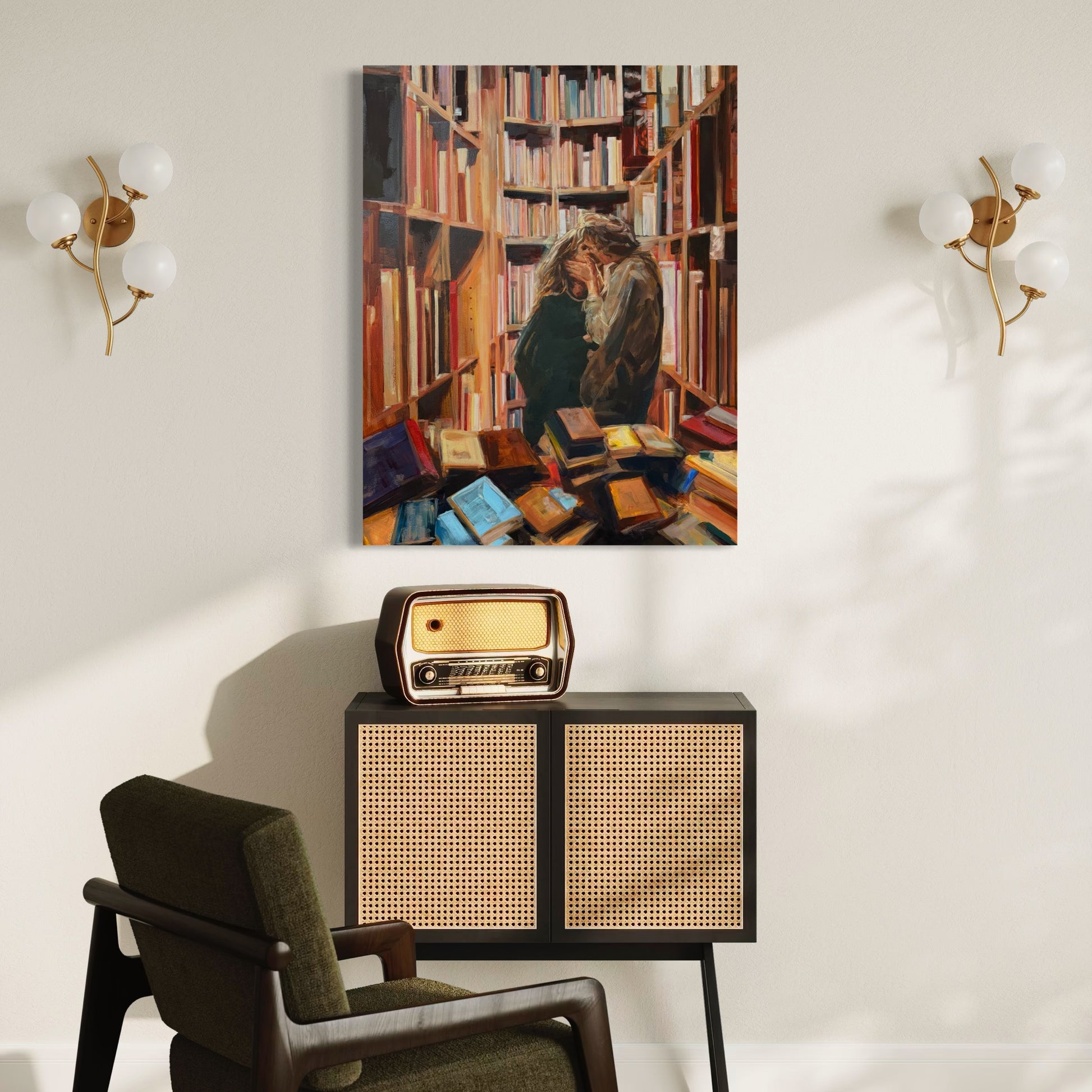Discover the romantic allure of this captivating oil painting featuring a couple sharing a tender kiss in a cozy, intimate corner of a bookstore. With warm lighting, rich book-lined walls, and emotional depth, this artwork perfectly captures the magic of love and literature. Ideal for collectors, romantics, or anyone looking to add a touch of passion and charm to their space. Original painting for sale — a timeless piece celebrating connection, nostalgia, and quiet moments of affection.